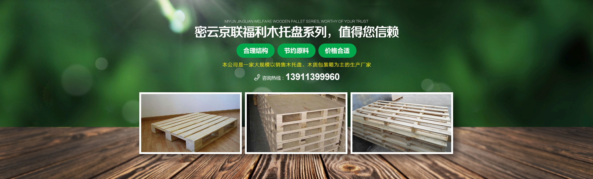 北京京聯(lián)國(guó)順木制品有限公司 (原北京市密云縣京聯(lián)福利木制品廠)成立于1993年,位于北京市密云縣西田各莊鎮(zhèn)蒼頭村,占地約5000平米。我公司工廠是一家大規(guī)模以銷售木托盤為主的生產(chǎn)廠家。本工廠是一家直接采購原木,按客戶要求生產(chǎn)規(guī)格尺寸的托盤,我公司工廠位于河北省承德市有著木材加工點(diǎn),可以做到,從山上的木頭下山到客戶手中的托盤都是一手貨,減少了中間商的費(fèi)用,所以我公司售出的產(chǎn)品對(duì)北京這個(gè)龐大的市場(chǎng)來說在同樣的規(guī)格尺寸的托盤來說價(jià)格比較占優(yōu)勢(shì)。